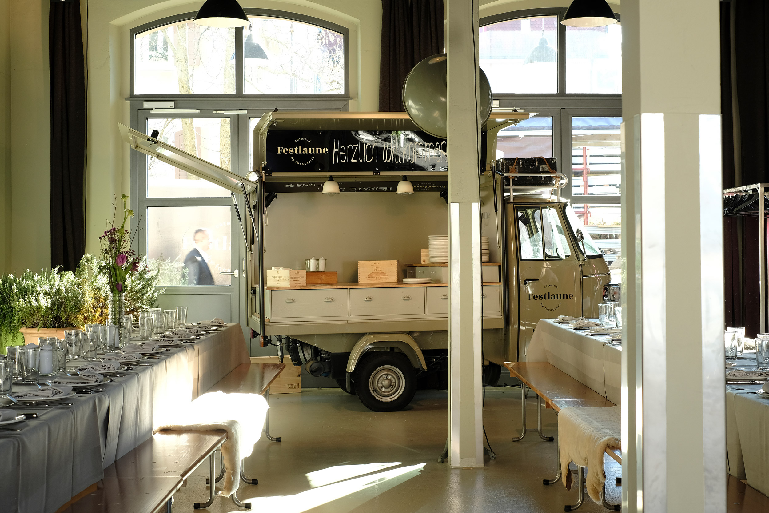 In unserer Eventküche kannst du dich im privaten Rahmen von uns bekochen & verwöhnen lassen und dein Fest in einer einmaligen, urbanen & grosszügigen Industriehalle geniessen. Hohe, luftige Räume, grosse Rundbogenfenster, perfekte Akustik, individuelle Einrichtungsmöglichkeiten, ein grosszügiger Vorhof, eine Musikanlage & Beamer werden dein Fest zum einmaligen Erlebnis machen.